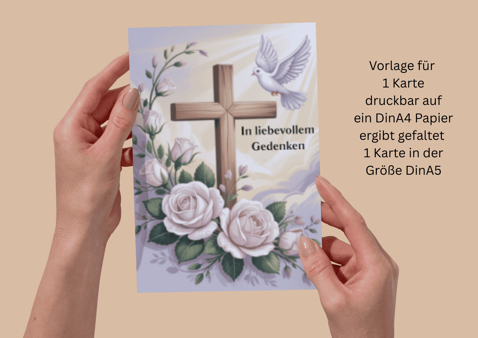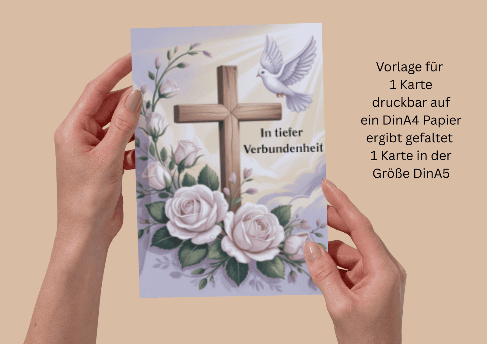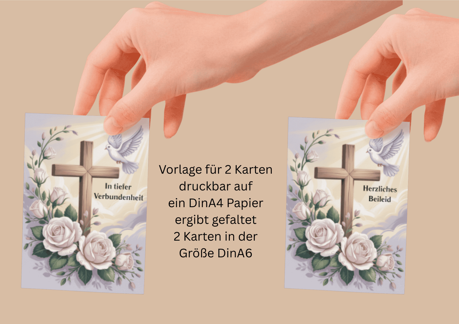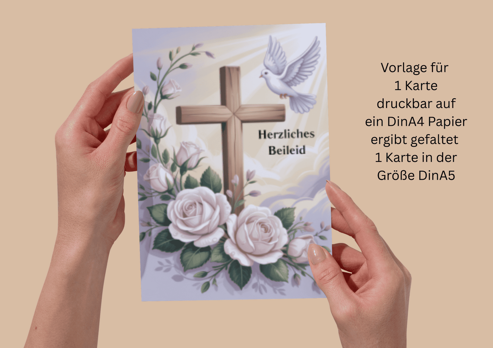 Diese Beileidskarten zum Ausdrucken mit Kreuz, Taube und Rosen schenken einen stillen Gruß, wenn dir die Worte fehlen. Sie lassen sich beliebig oft ausdrucken und sind in DIN A5 und DIN A6 nutzbar – für einen würdevollen, persönlichen Ausdruck von Mitgefühl.