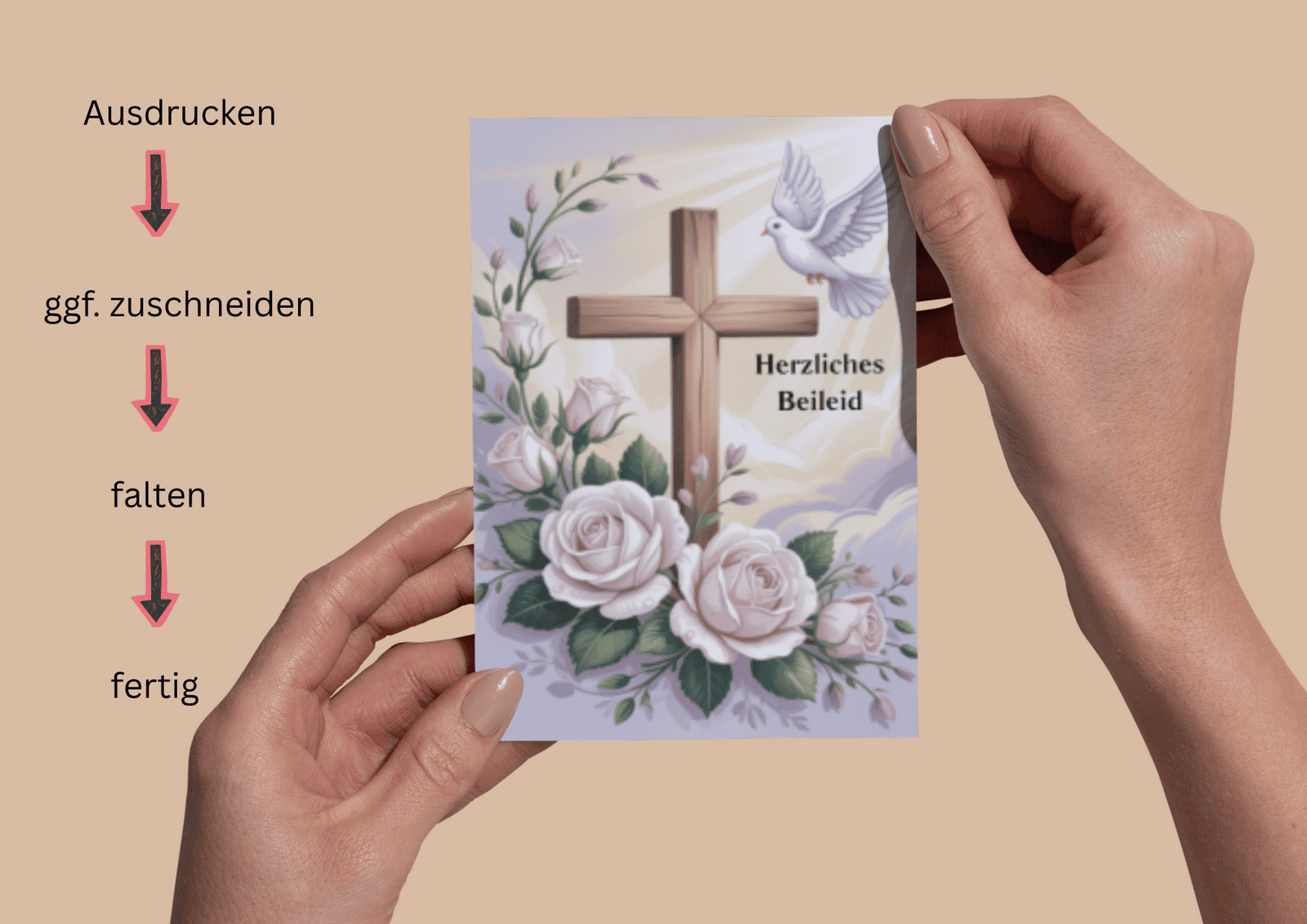 Nach dem Kauf stehen dir die Beileidskarten sofort als Download zur Verfügung. Du kannst sie direkt ausdrucken, zuschneiden und falten – ganz flexibel und ohne Wartezeit oder Versand. So hast du auch kurzfristig eine passende Karte zur Hand und kannst selbst entscheiden, welche Größe und welcher Spruch in diesem Moment richtig ist.