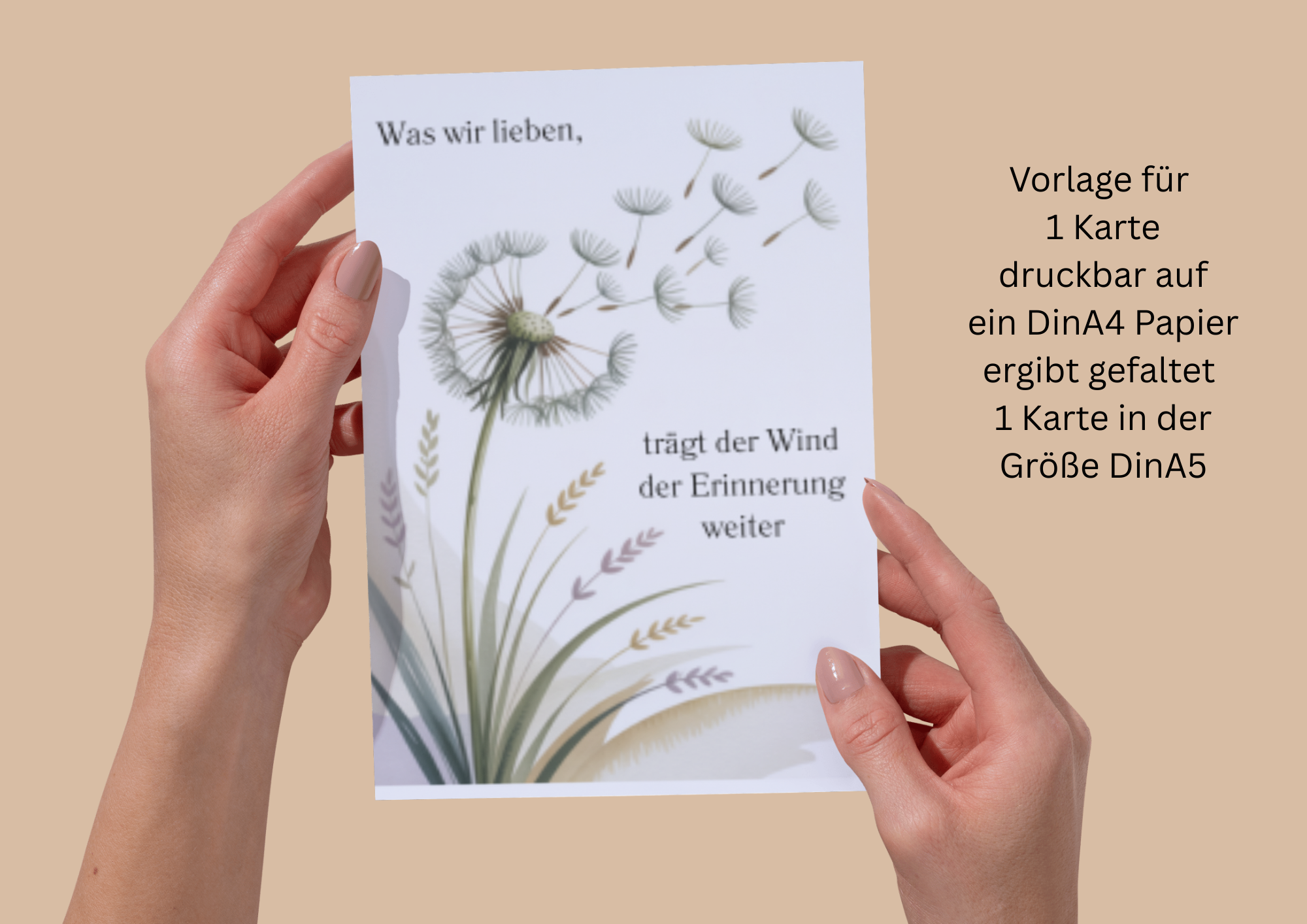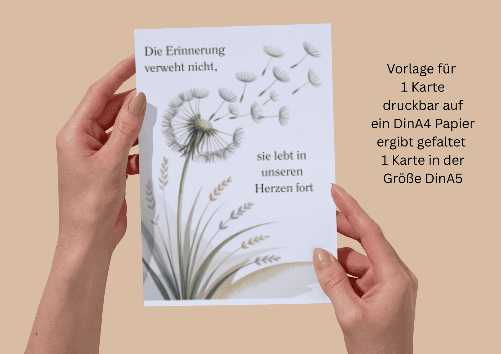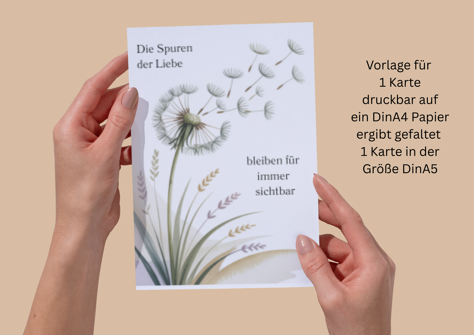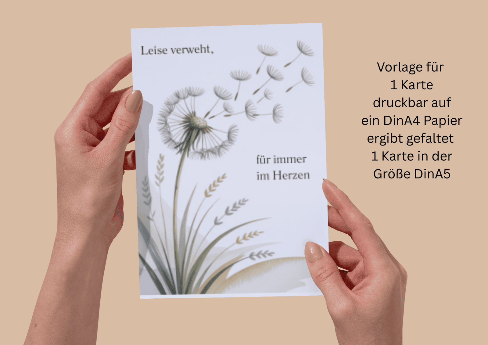 Diese Beileidskarten zum Ausdrucken mit Pusteblume schenken einen stillen Gruß, wenn Worte fehlen – zurückhaltend, liebevoll und mit Raum für das, was bleibt. Sie lassen sich beliebig oft ausdrucken, genau dann, wenn du sie brauchst – in DIN A5 oder DIN A6. Ideal für einen würdigen, persönlichen Abschied und deinen Ausdruck des Mitgefühls.