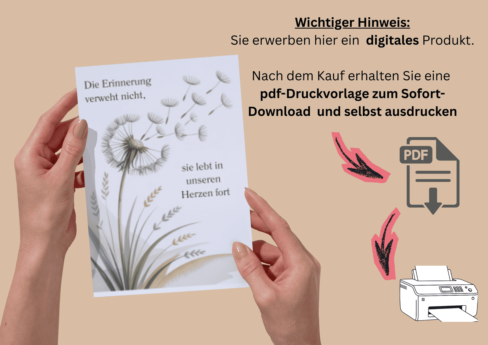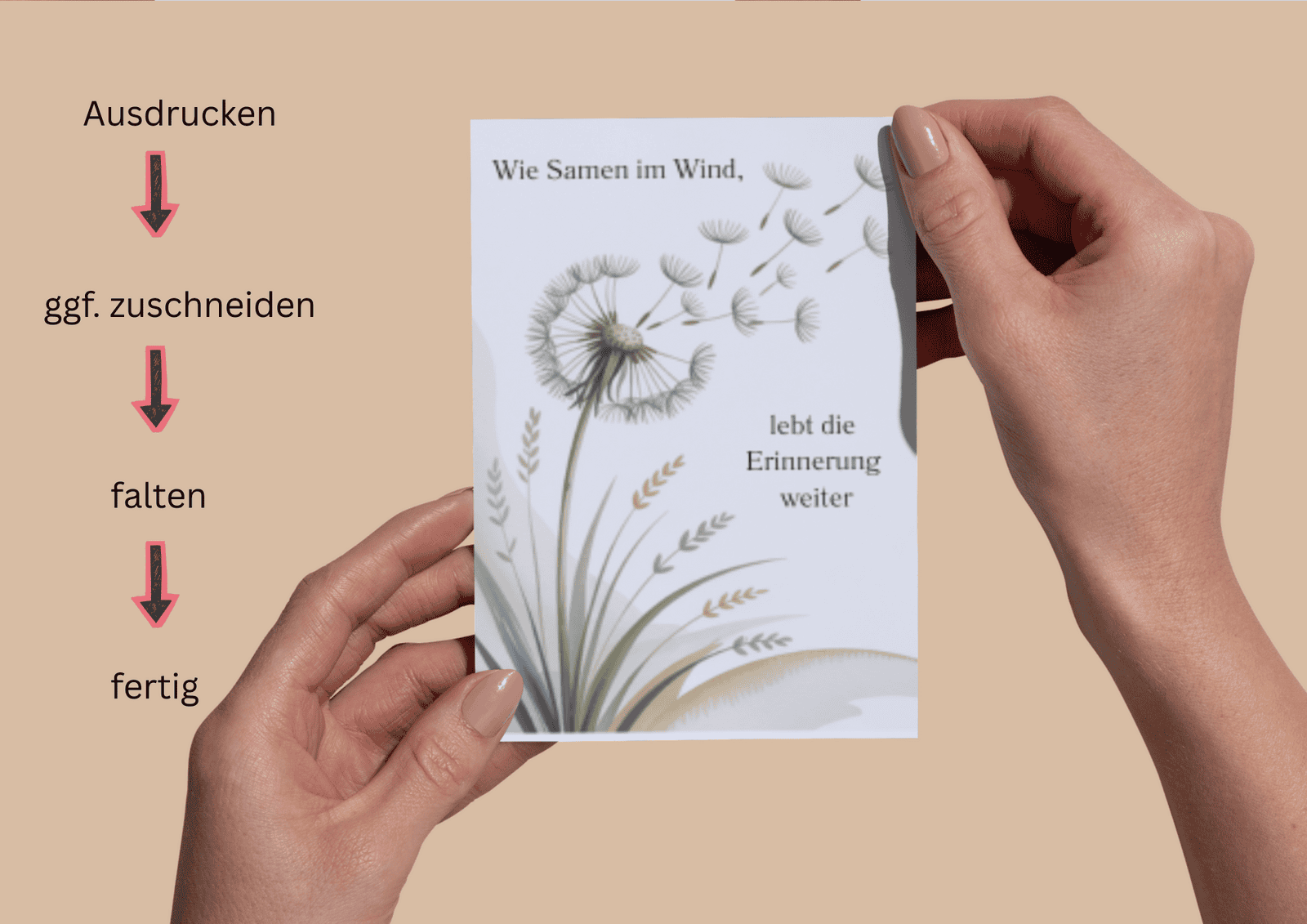 Nach dem Kauf stehen dir die Beileidskarten sofort als Download zur Verfügung. Du kannst sie direkt ausdrucken, zuschneiden und falten, schon sind sie fertig – ganz flexibel und ohne Wartezeit oder Versanddauer. Ideal, wenn du kurzfristig eine würdevolle Karte benötigst oder bewusst selbst entscheiden möchtest, wie viel Text und Gestaltung passend sind.