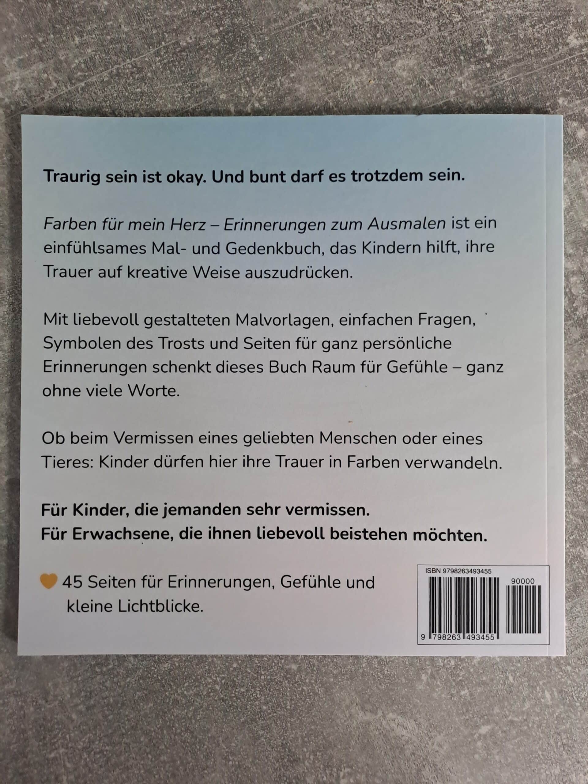 Dieses liebevoll gestaltete Mal- und Gedenkbuch „Farben für mein Herz“ unterstützt Kinder dabei, ihre Trauer auszudrücken – mit Farben, Bildern und Platz für Erinnerungen.